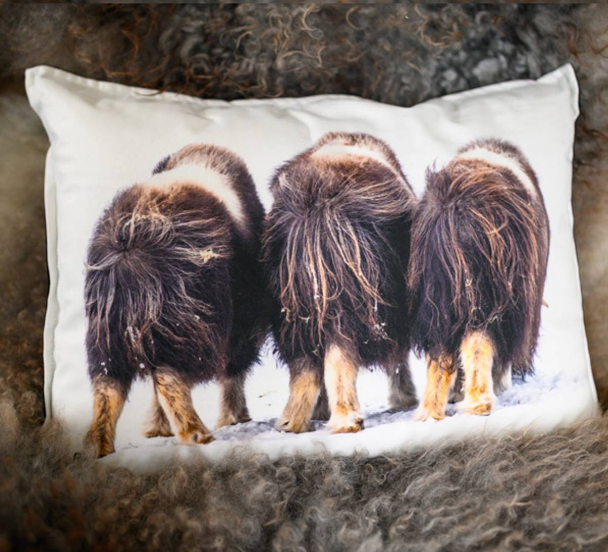 En flott pute med norske moskus som motiv. Fotograf Even Agerup, som bor på Dovre, har tatt bildet og firmaet Br. Flaarønning har produsert puten.