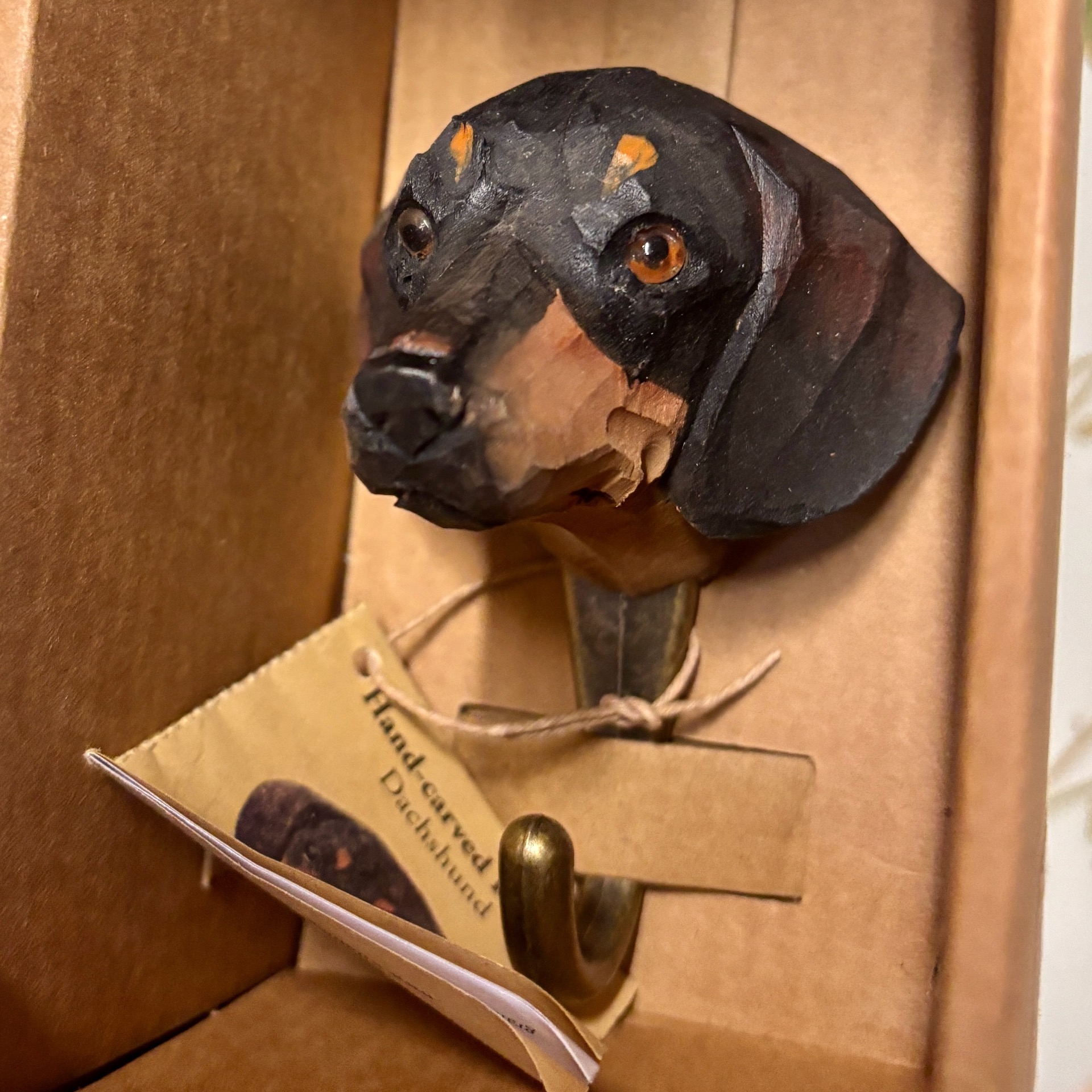Hva med en håndlaget knagg på veggen i tre med et vakkert dachse-hode? Dette er et litt overraskende og morsomt interiørelement, som både kan holde håndkleet, badekåpen din eller vesken. Eller hva du ønsker - selvsagt. Den er håndmalt med pensel i naturlige farger. Selve knaggen er i bronsefarget metall.