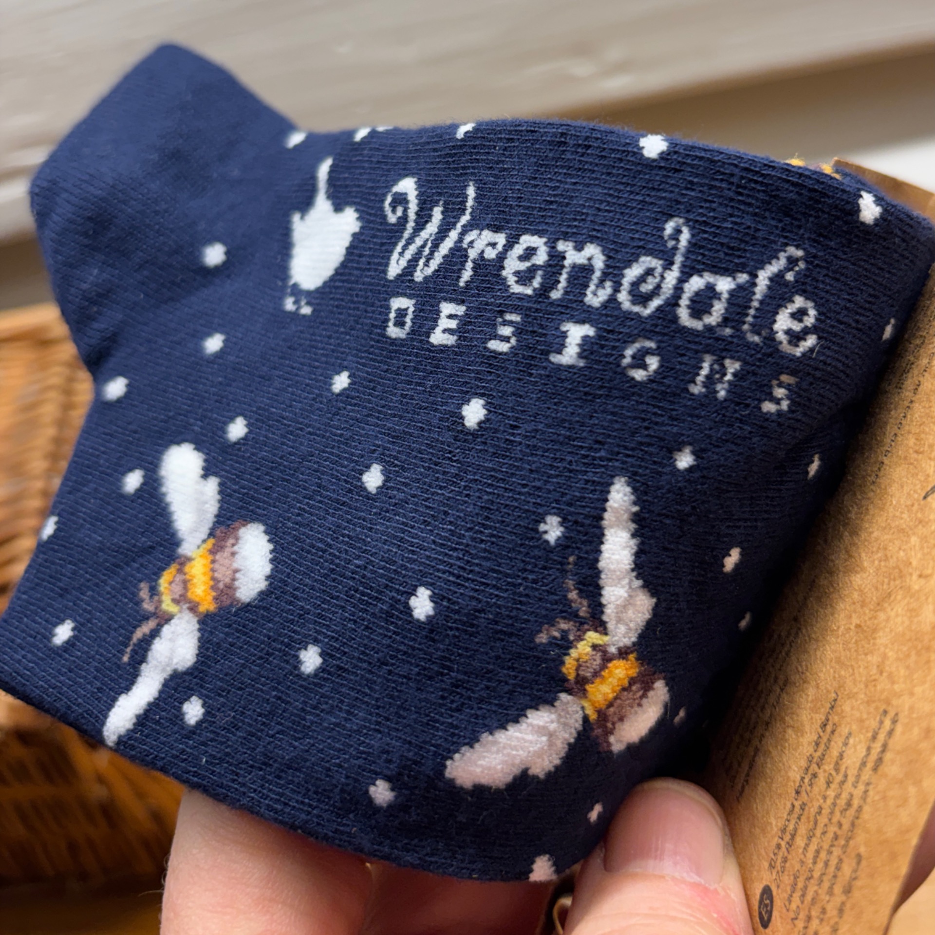 Wrendale Designs er kjent for god kvalitet og disse mørkeblå sokkene med bie-mønster er ikke noe unntak. De er laget for damer og de passer til 37 til 42-størrelsen.