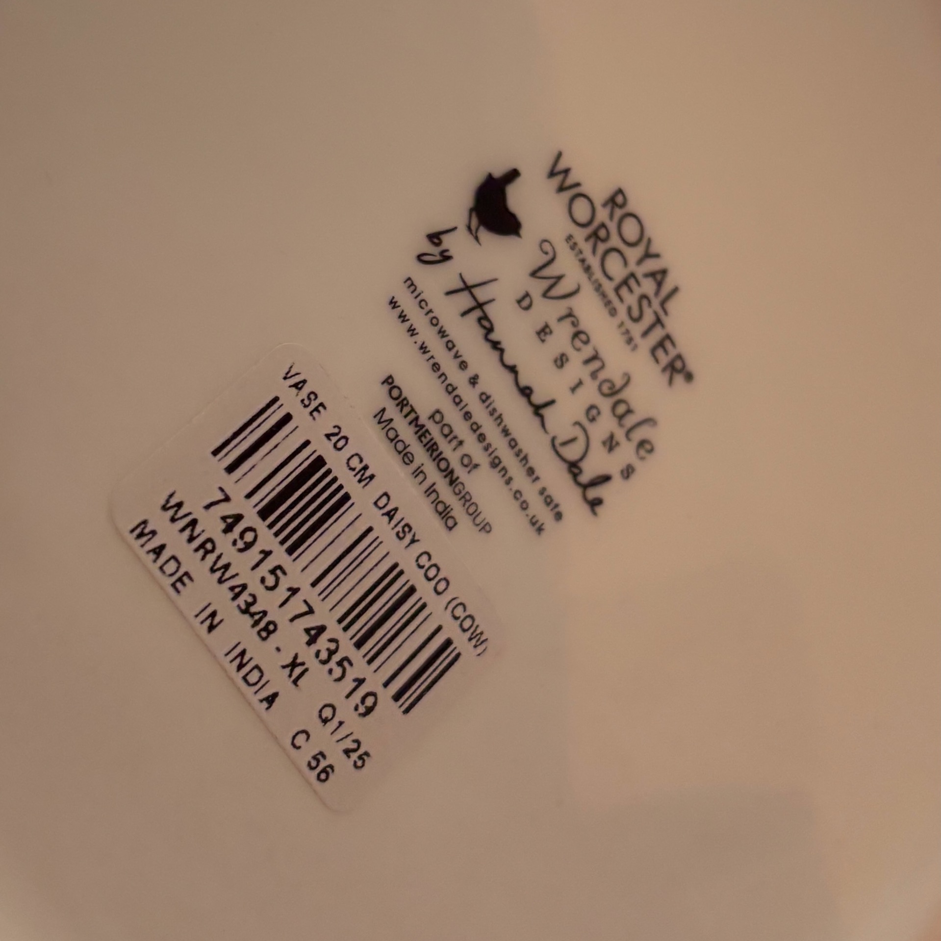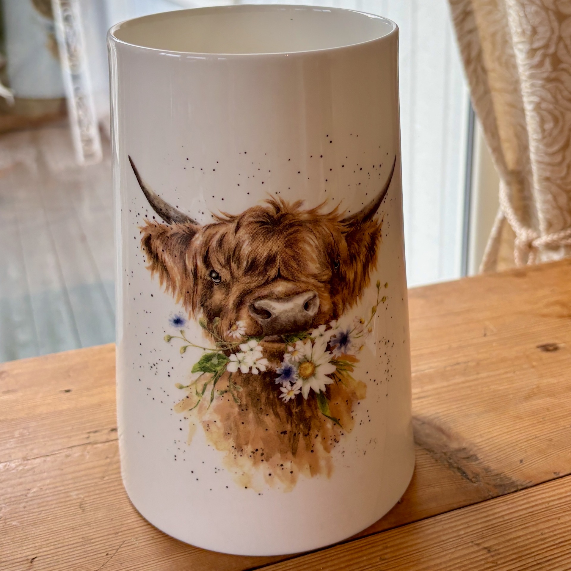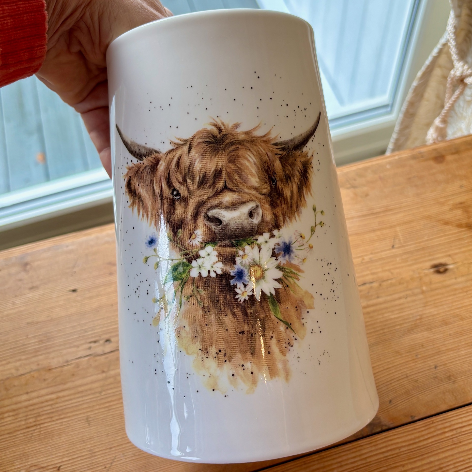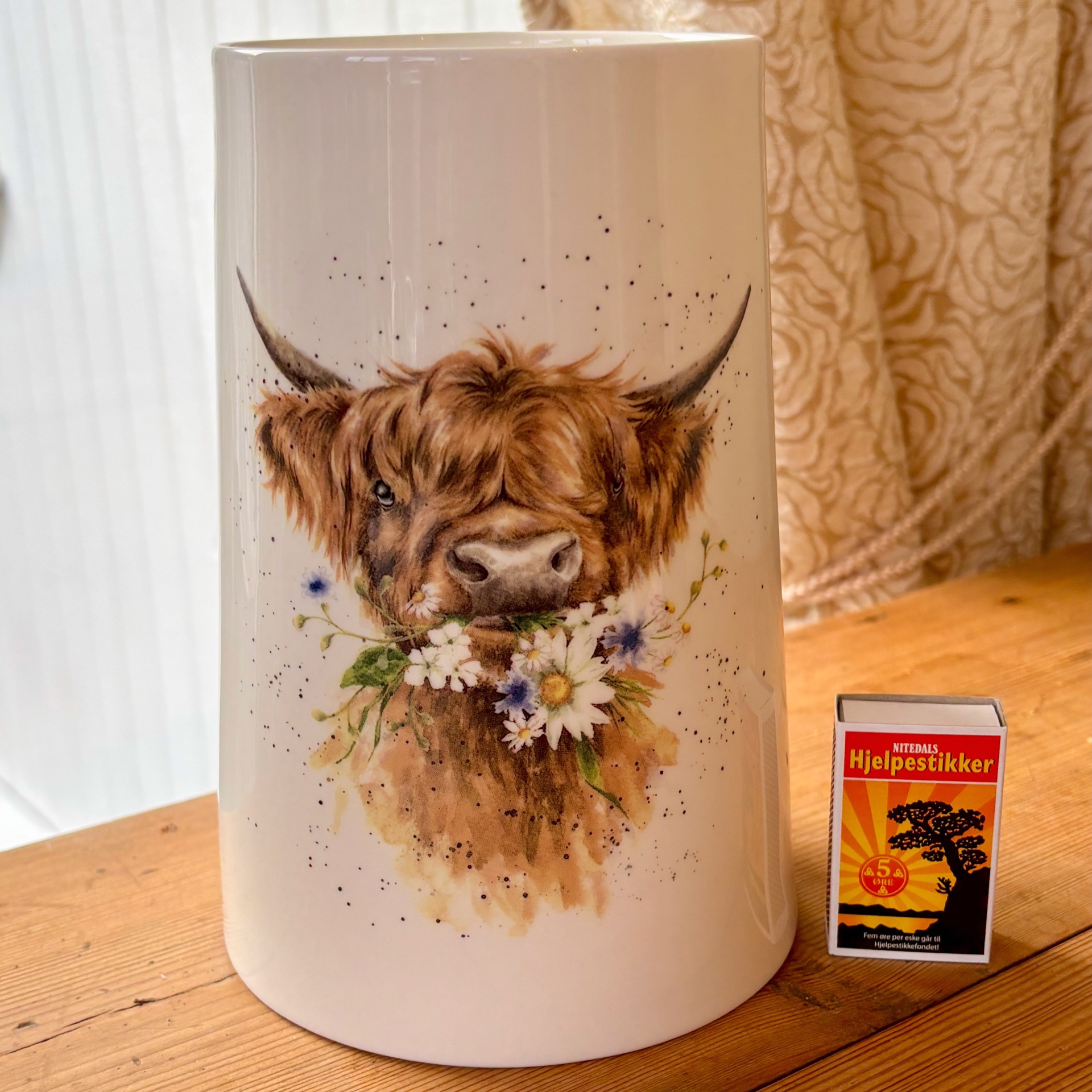 Royal Worcester og Wrendale Designs har slått sine pjalter sammen og laget denne overdådig flotte vasen med en Highland cow, selveste Daisy Coo! Illustrasjonen er Hannah Dale (Wrendale Design) sin akvarell. Higland cow er vel bortimot den mest kjente illustrasjonen til Wrendale :-)