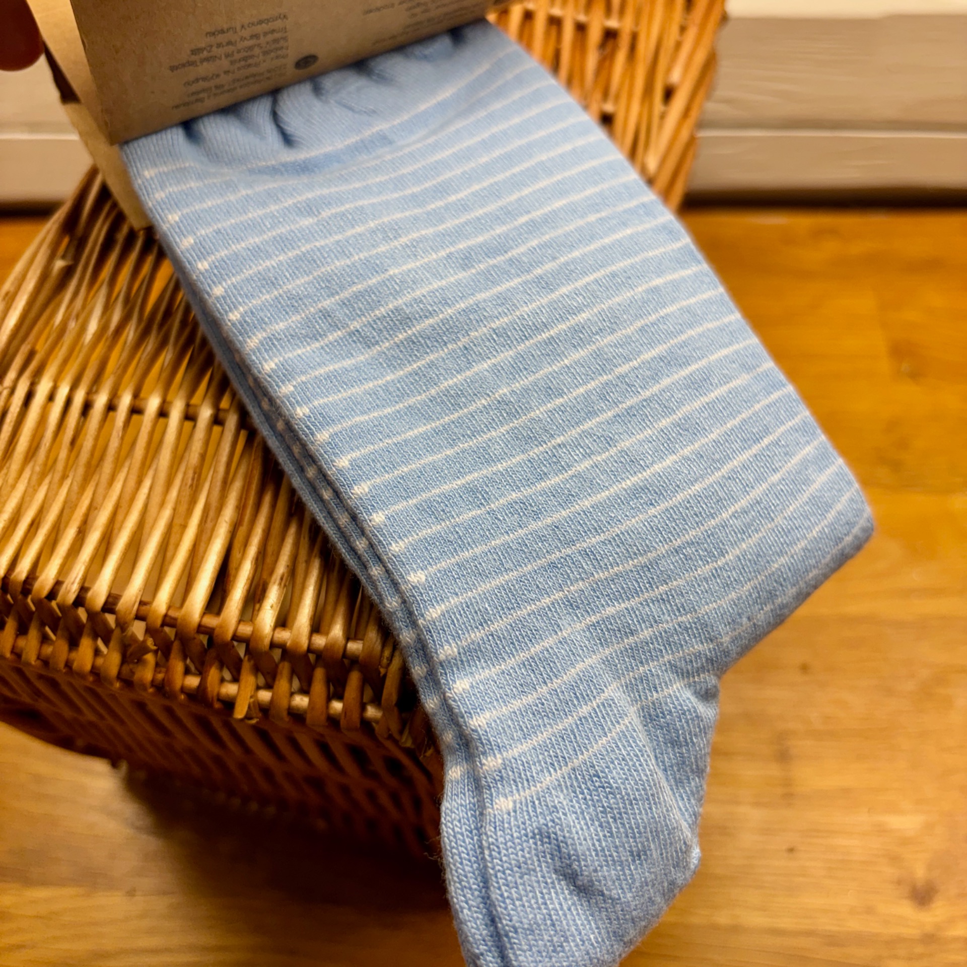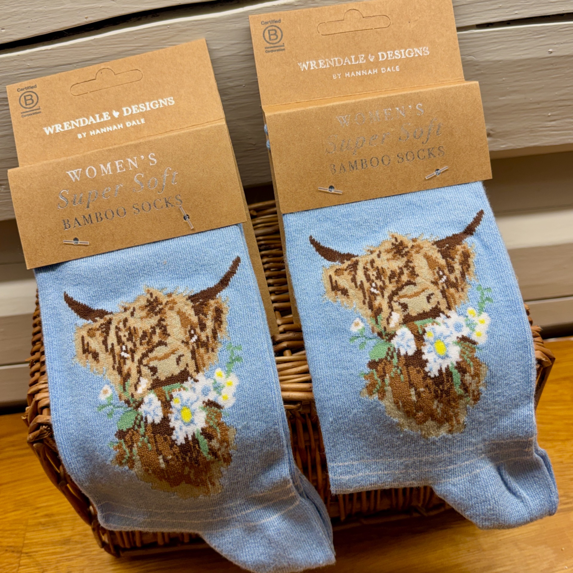 Engelske Wrendale Designs "varemerke" er Highland fe - som pryder denne sokken. Motivet er på begge sider av sokken. Grunnfargen er lyseblå og det er hvite striper på foten.